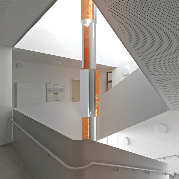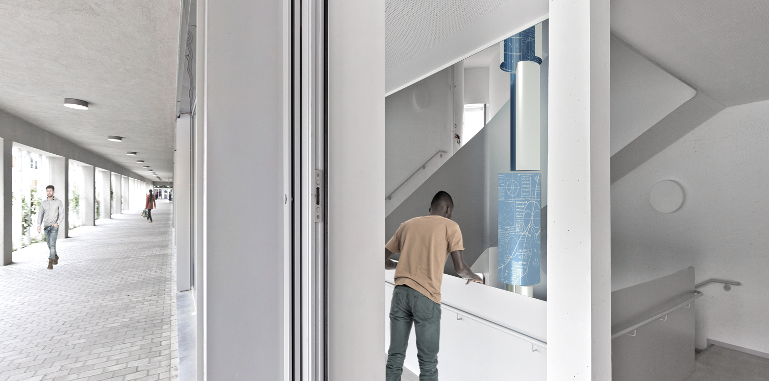 Im Institutsgebäude sind die sechs Treppen als Kreuzungs- und Angelpunkte der Erschließung Orte einer sechsteiligen Installation. Jede der Einzelinstallationen ist durch eine eigene Farbe gekennzeichnet und bieten dadurch Orientierung im Gebäude. Abhängig von den unterschiedlichen Höhen der Lufträume in den Treppenaugen umfassen die Installationen zwei bis sechs aus Aluminium geformte Segmente, die als Abstraktion »eingerollter Blätter« gelesen werden können. Die »Blätter« sind unterschiedlich gebogen. Ihre Formvariation beruht auf einer euklidischen geometrischen Konstruktionsweise. Semiotisches und kalkulatorisches Bewusstsein werden durch die Geometrie integriert. Die Segmente sind jeweils einseitig farbig lasiert. Die Lasierungen der Segmente offenbaren durch Auslassungen grafische Notationen – ähnlich denen des Bibliotheksfoyers – auf ihrer metallischen Oberfläche. Einige der Blätter sind innen lasiert und verbergen ihren Inhalt, andere legen ihn auf der äußeren Seite offen. Als vertikale Struktur durchkreuzen die Segmentfolgen die horizontal geprägte Anlage des Gebäudes und machen Höhen deutlich, gleich einem Echolot. Der Affordanzcharakter der Arbeit zeigt sich im Versuch, den Bildwelten einer der Installationen zu folgen. Der Betrachter ist gezwungen, sich konzentrisch um sie zu bewegen, die Treppe nach oben oder unten zu nehmen. Ein Perspektivwechsel wird erforderlich, jene Bewegung, die oft auch Bedingung von Erkenntnis ist. Zugleich wird Licht gestreut die jeweilige Farbe verbreitet sich im Raum und »Dinge werden in einem neuen Licht gesehen«. Mit der Bewegung spiegelt sich der Betrachter und seine Bewegung schemenhaft in den Oberflächen. Durch die Reflexion gibt es eine Überlagerung von Subjekt und Zeichen.